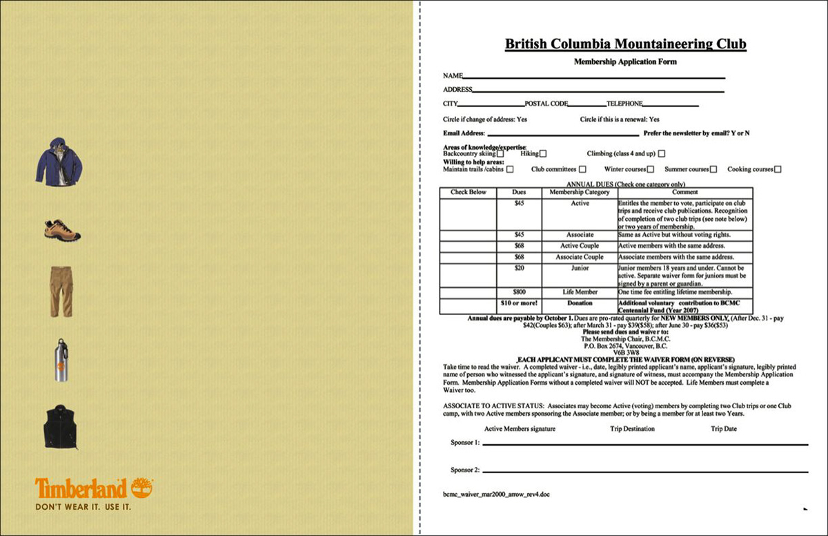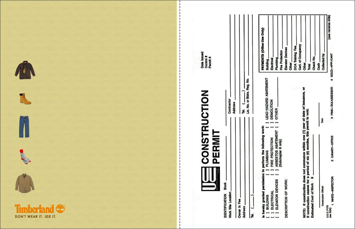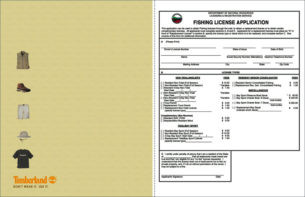We created Timberland spreads designed with actual applications and permits for construction, fishing and mountain climbing attached. Readers could tear out, fill in and submit to the appropriate places.
